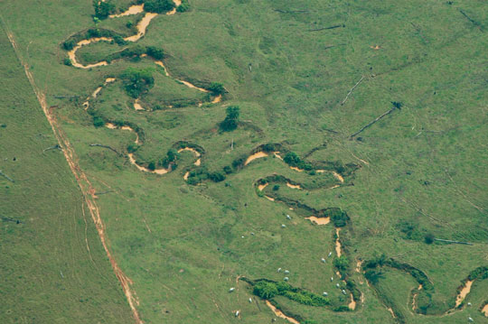 Desmatamento em córrego- tributário do rio Acre. No passado, ele já foi uma linha no meio da floresta. Hoje, é um retrato da devastação que pode se tornar permanente, caso o projeto que altera o Código Florestal seja aprovado como está no Senado.(Foto: Margi Moss)