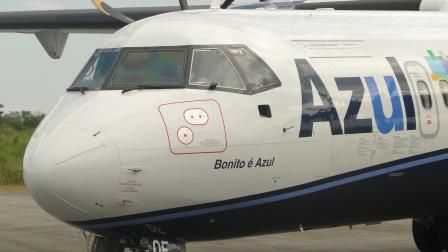 "Bonito é Azul", esta era a frase no bico do avião da empresa aérea Azul que pousou às 12h27 deste domingo (28) em Bonito (MS) o primeiro voo direto do Aeroporto Internacional de Campinas (SP) com 38 passageiros.