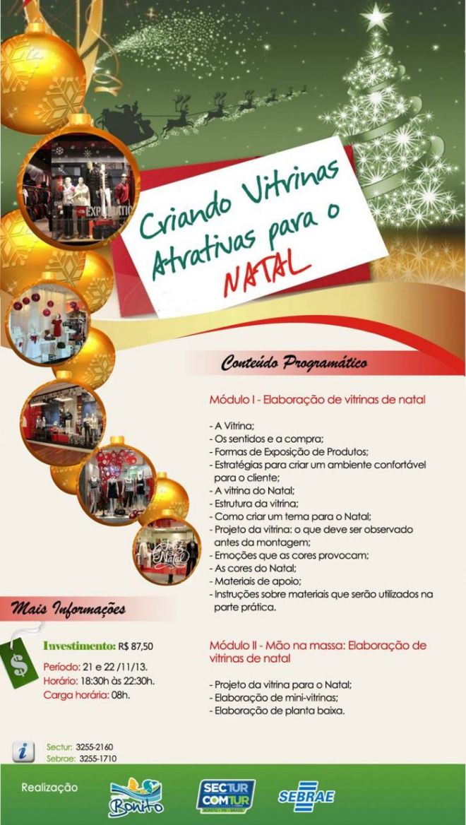 Entre os dias 21 e 22 de novembro, das 18h30 às 22h30, será realizado o curso de criação de vitrinas atrativas para o Natal.