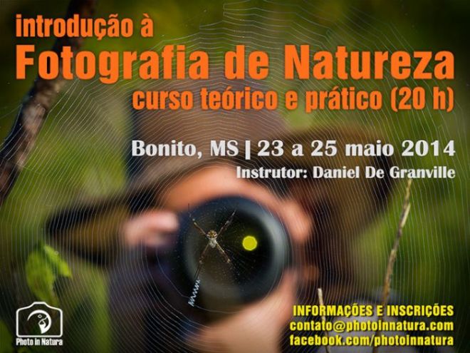 Estão abertas as inscrições para o curso de Introdução à Fotografia de Natureza. As aulas teóricas e práticas, ministradas pelo fotógrafo Daniel De Granville, acontecerá entre os dias 23 e 25 de maio de 2014, em Bonito (MS).